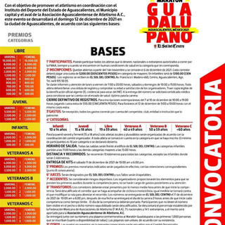 En esta ocasión se realizará con las medidas y protocolos sanitarios necesarios para evitar contagios de Covid-19. En esta ocasión se repartirá una bolsa de más de 100 mil pesos en seis categorías, divididos en femenil y varonil y una única de plusválidos. Este evento se desarrollará el próximo domingo 12 de diciembre de 2021 en la capital de Aguascalientes.